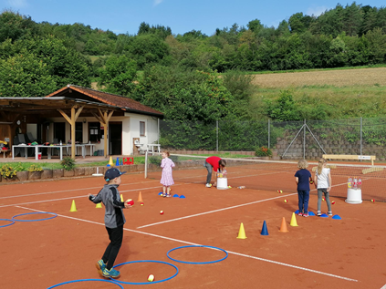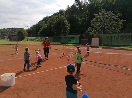 Kurz vor den Ferien hieß es für die Kindergartenkinder der Kita St. Elisabeth Dittwar wieder los auf das Sportgelände zum TSV Dittwar 1931 e.V.. Die Kinder konnten sich an zwei Stationen – Fußball und Tennis – ausgerüstet mit Fußbällen und Tennisschlägern durch verschiedene Übungen ausreichend bewegen. Auch die neuen Low-T-Ball-Anlagen kamen auf dem Tennisplatz zum Einsatz. Hier konnten die Kinder ihr Geschick im Umgang mit Ball und Schläger beweisen. Dabei hatten die Kindern ersichtlichen Spaß. Durchgeführt wurden die Stationen von den Vereinsmitgliedern Carolin Geiger, Marvin Künzig und Christian Spies.