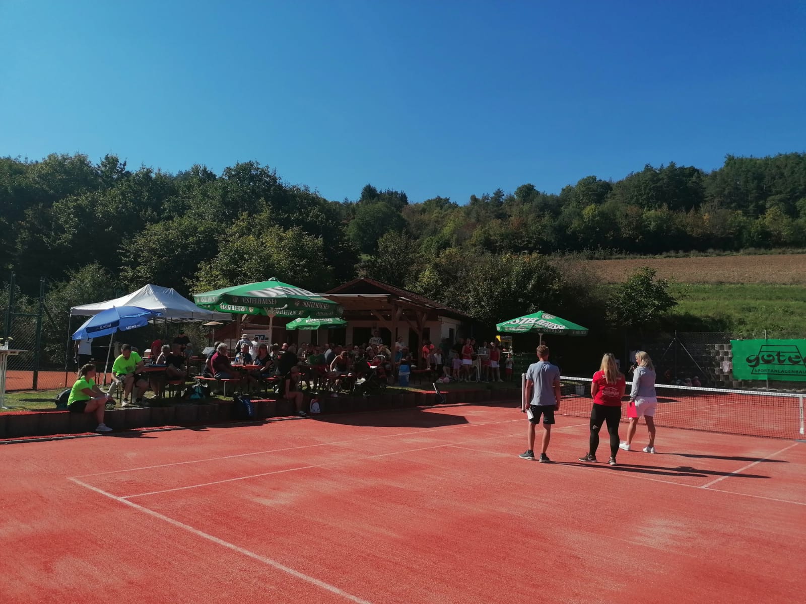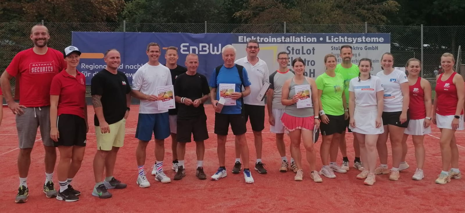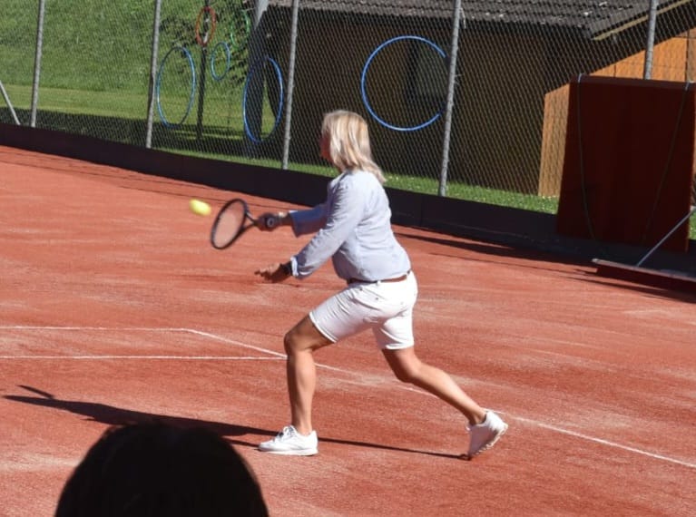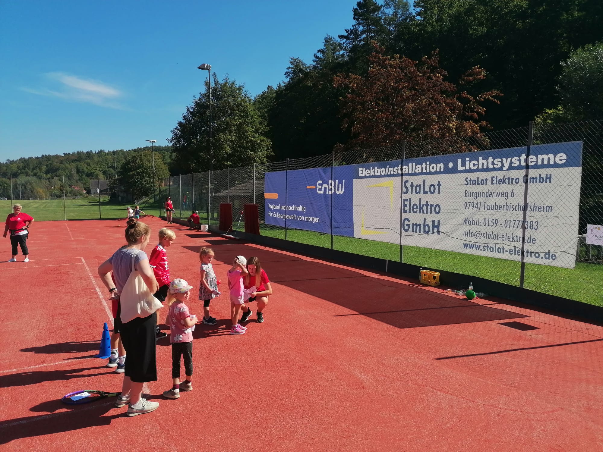 Außerdem dankte sie den zahlreichen Firmen- sowie Privatspendern, durch die ein erfreulich großer Anteil der Finanzierung gestemmt werden konnte und die nun auf einer Spendertafel auf der Anlage verewigt sind. Bürgermeisterin Annette Schmidt brachte ihre Anerkennung für den großen Einsatz der Mitglieder zum Ausdruck – ohne die Feierlichkeiten waren bereits etwa 500 ehrenamtliche Arbeitsstunden geleistet worden. Außerdem überreichte sie symbolisch einen Scheck der Stadt Tauberbischofsheim, welche den Umbau nach ihren Förderrichtlinien finanziell unterstützte. Im Anschluss griff sie selbst zum Schläger und überzeugte sich aktiv von der Qualität der neuen Plätze. Mit ihrem Mitarbeiter Ralf Lotter zeigte sie in mehreren Ballwechseln ihr Können mit dem Tennisschläger und eröffnete die Plätze somit offiziell. Für das anschließende Spender-Firmen-Doppel-Turnier fungierte sie außerdem als Losfee. Acht Teams kämpften hier, zunächst aufgeteilt in zwei Gruppen, im Modus „Jeder gegen jeden“ und auf Zeit um die beste Platzierung. Die vielen Zuschauer sahen dabei abwechslungsreiche Ballwechsel und viele spannende Spiele. Zeitgleich standen den Gästen weiterhin viele Spielmöglichkeiten auf dem letzten verbliebenen Sandplatz zur Verfügung, Kaffee und Kuchen sorgten für das leibliche Wohl.